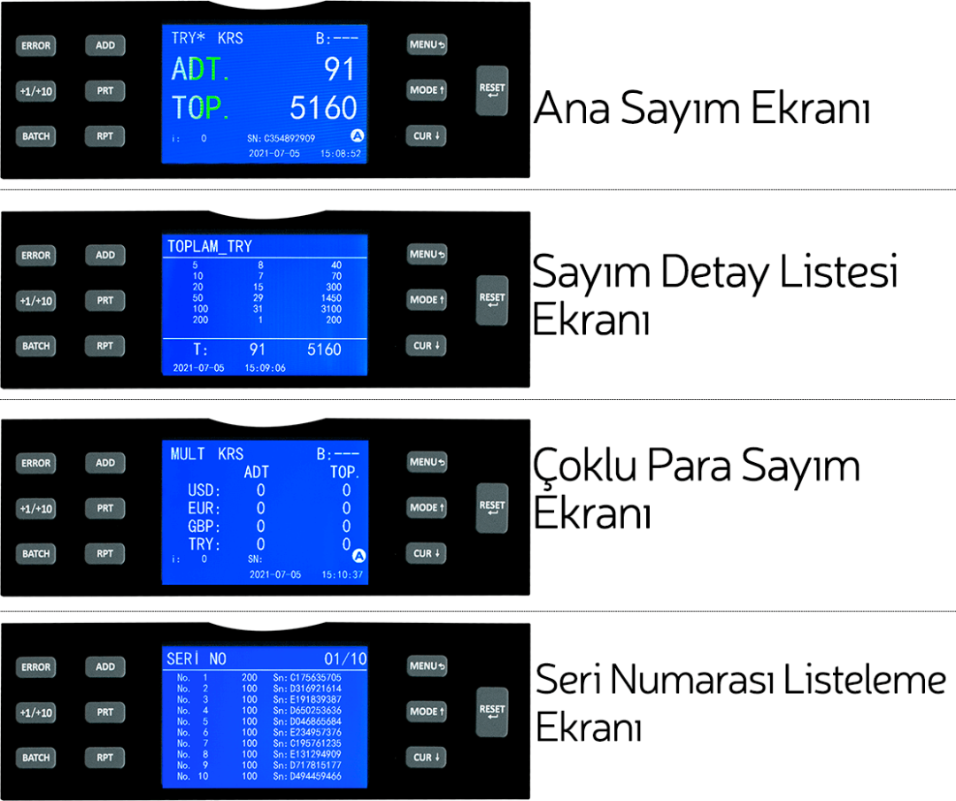 يحتوي النموذج مع التعرف التلقائي على الأموال على خيارات عد متقدمة مثل المال المختلط ، والأموال الفردية ، والوجه ، والاتجاه ، والعد المسطح. بهذه الطريقة ، يمكن للمستخدم حساب المال كما يشاء وتكديس المال كما يشاء في نفس الوقت.بالإضافة إلى ميزة الإضافة والدعم ، يتوفر وضع العد “المتعدد” لحساب tl و USD و EURO و GBP المختلط في نفس الوقت. بالإضافة إلى ذلك ، يمكن للمستخدم حظر الأموال التي تنتمي إلى هذا الرقم التسلسلي عن طريق إضافة الرقم التسلسلي للأموال المطلوبة إلى “القائمة السوداء”.